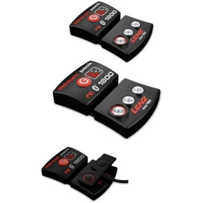 Lenz Lithium Pack Rcb 1800, litiumbatteri som festes på sokken med trykknapper. Varmen kan justeres i tre nivåer med knappene på batteriet eller med en smarttelefon som kobles til batteriet via Bluetooth.